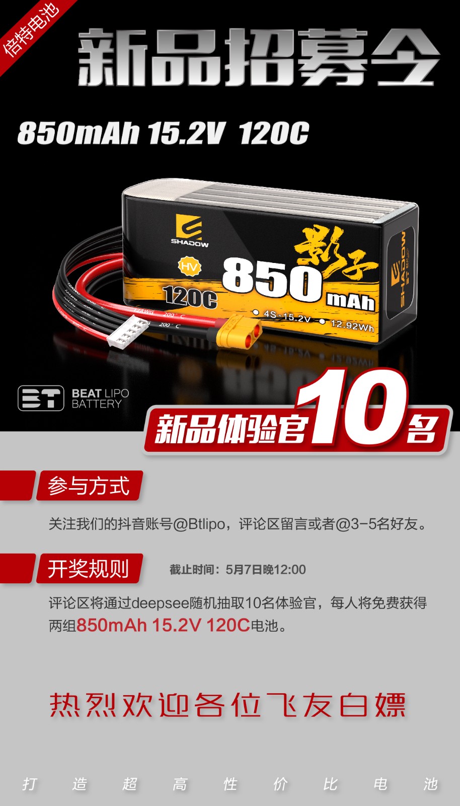 快来关注倍特电池官方抖音号,来参与新品体验官,领取免费电池。